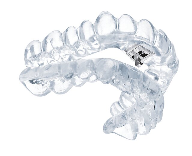 In vielen Fällen kommt eine individuell angefertigte Aufbiss-Schiene zum Einsatz. Sie entlastet die Kiefergelenke, entspannt die Muskulatur und unterstützt eine physiologische Kieferposition.